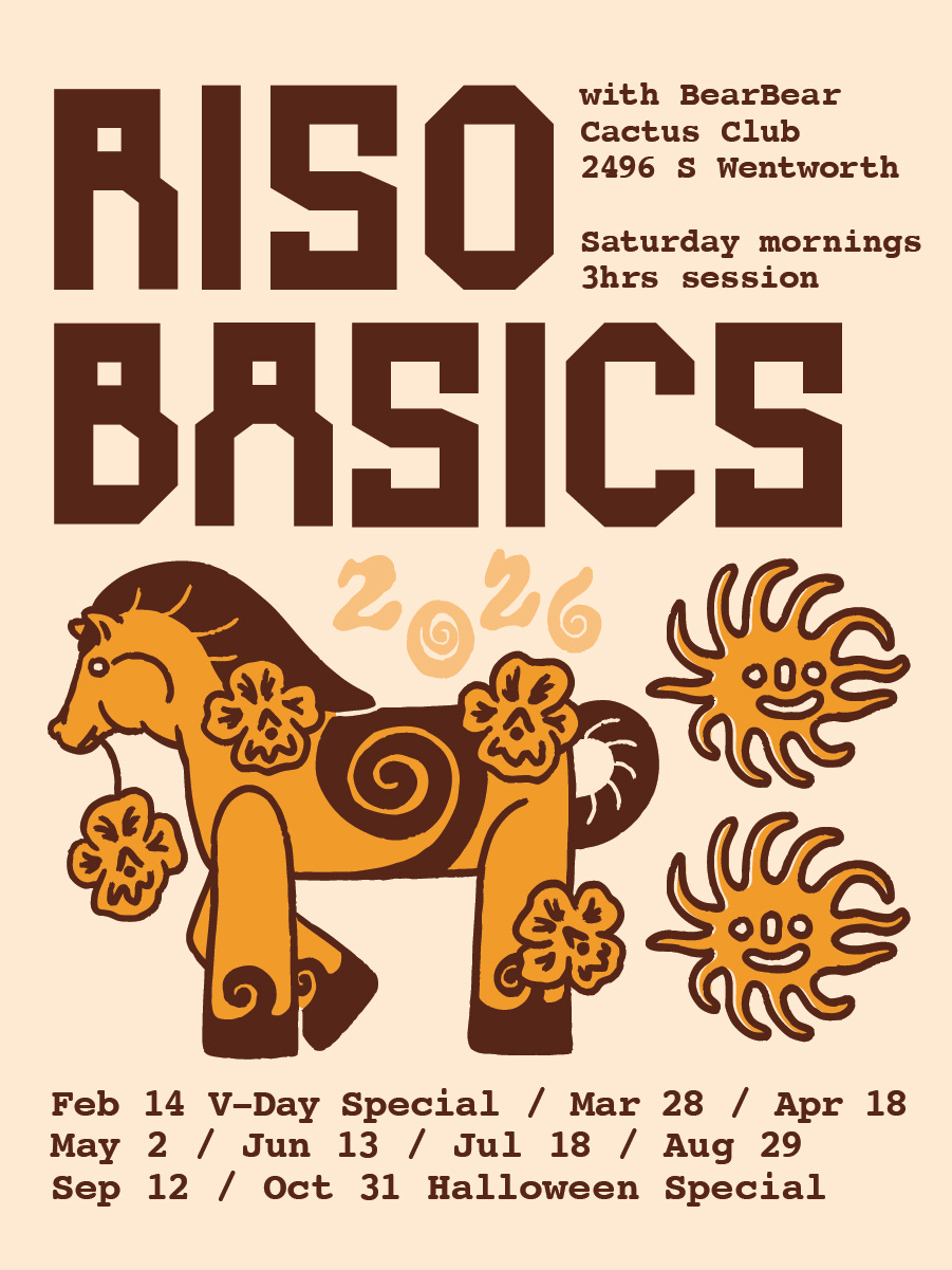 For the first time in BearBear history, we’re scheduling Riso Basics workshops for a full year. We took January, November, and December off. Those months will be for catch-up, retail, and holiday markets. It’s taken us HOW MANY YEARS to figure this out???? Ticket links will be up on Cactus Club’s events and on our website soon.